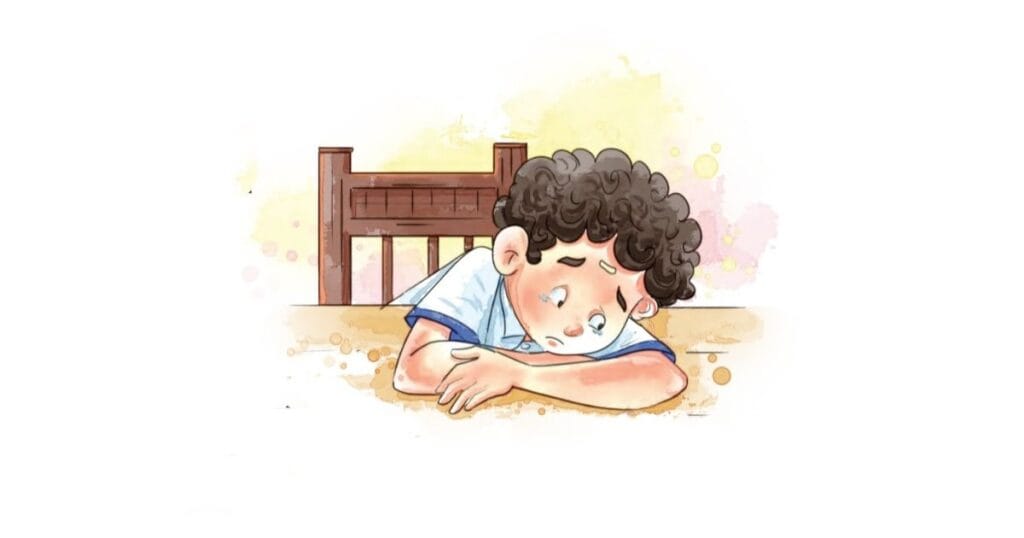 He removed his shoes and placed them in the corner. He went inside and dropped his school bag on the study table. He sat on the chair and rested his head on the table.