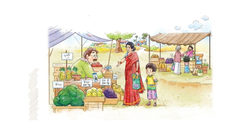 “What is the cost of the pineapples?” Kamala asked. “Forty-five rupees each,” replied the fruit seller.