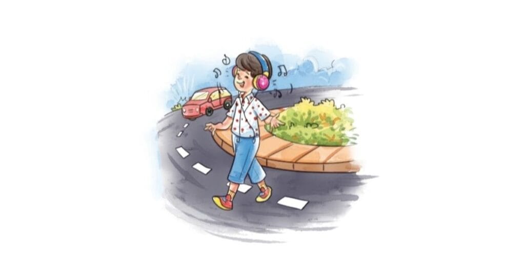 Do not play or get distracted near roads. Also, avoid using headphones or mobile phones while walking near traffic. These can distract you from traffic sounds.