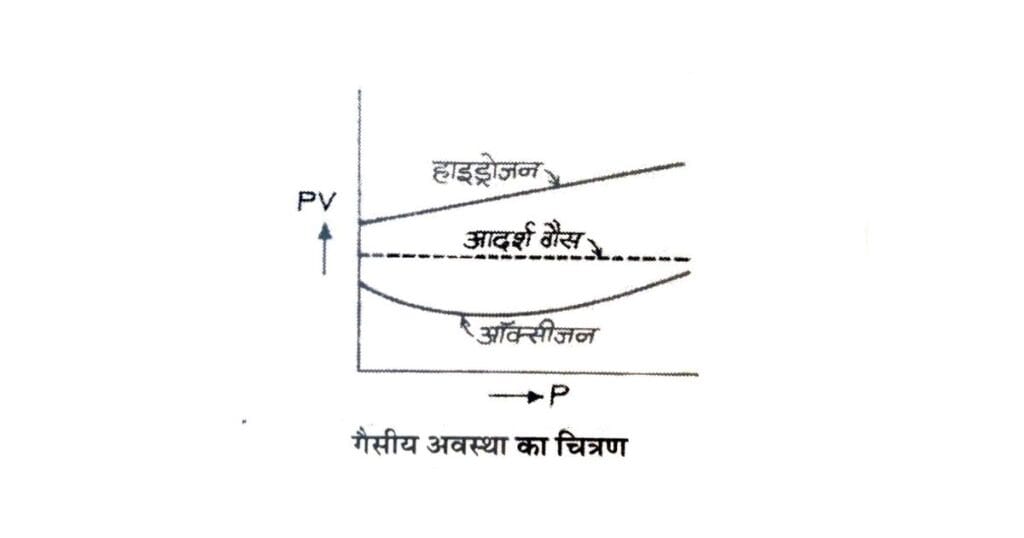 परन्तु वास्तविक गैसों का दाब बढ़ाने पर व्यवहार भिन्न-भिन्न होता है। जैसे – हाइड्रोजन का दाब बढ़ाने से उसके दाब (P) व आयतन (V) के गुणनफल का मान बढ़ने लगता है। जबकि ऑक्सीजन का दाब बढ़ाने पर पहले PV का मान घटता है फिर बढ़ने लगता है।