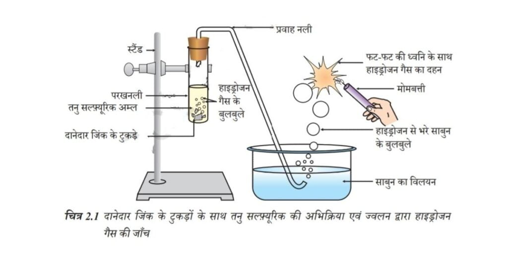 चित्र 2.1 दानेदार जिंक के टुकड़ों के साथ तनु सल्फ्यूरिक की अभिक्रिया एवं ज्वलन द्वारा हाइड्रोजन गैस की जाँच