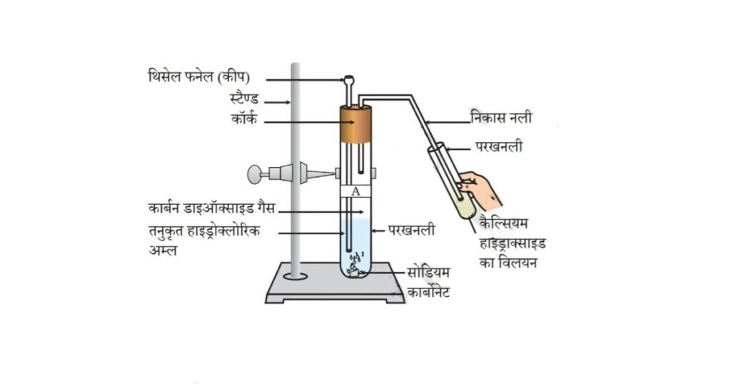 परखनली ‘A’: Na2CO3 (s) + 2HCl(aq) → 2NaCl(aq) + H2O(1) + CO2(g)