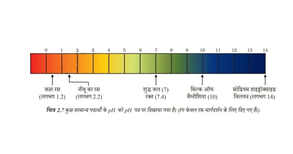 • एक उदासीन विलयन के pH का मान 7 होता है, जबकि अम्लीय विलयन के pH का मान 7 से कम एवं क्षारकीय विलयन के pH का मान 7 से अधिक होता है।