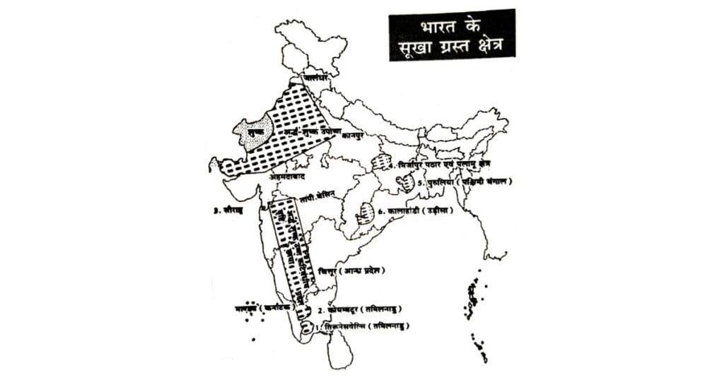 (ii) सूखाग्रस्त क्षेत्र – ये वैसे क्षेत्र हैं जहाँ सामान्य वर्षा 75 . से कम एवं वर्षा की विचलनशीलता सामान्यतः 25% है। सेमी इसके अंतर्गत गुजरात, राजस्थान, पंजाब, हरियाणा, प. उत्तर प्रदेश, प. मध्य प्रदेश, मध्य महाराष्ट्र, आंतरिक कर्नाटक, रायलसीमा, द. तेलगांना, तमिलनाडु के कुछ भाग, बिहार में चंपारण जिला, पूर्वी उत्तर प्रदेश के मिर्जापुर, झारखण्ड में पलामू, प. बंगाल में पुरुलिया व ओडिशा में कालाहांडी जिले आते हैं। ये क्षेत्र द्वितीयक हरितक्रांति के संभावित क्षेत्र हैं। यहाँ शुष्क कृषि प्रणाली, मृदा व जल प्रबंधन, ड्रिप व स्प्रिंकलर सिंचाई, सामाजिक वानिकी, भूमि उत्पादकता बढ़ाने के विविध प्रयास, वैकल्पिक अर्थ-व्यवस्था के रूप में पशुपालन का विकास आदि कार्यक्रम, सूखाग्रस्त कार्यक्रम (Drought Prone Area Programme) के तहत चलाए जा रहे हैं।