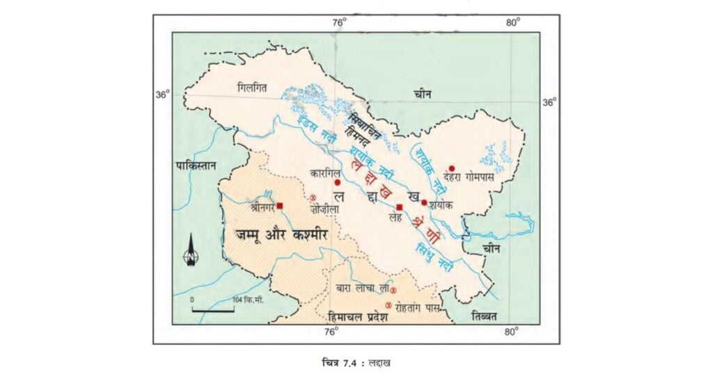 जम्मू एवं कश्मीर के पूर्व में बृहत् हिमालय में स्थित लद्दाख एक ठंडा रेगिस्तान है (चित्र 7.4)। इसके उत्तर में काराकोरम पर्वत श्रेणियाँ एवं दक्षिण में जास्कर पर्वत स्थित है। लद्दाख से होकर अनेक नदियाँ बहती हैं, जिनमें सिंधु नदी प्रमुख है। ये नदियाँ गहरी घाटियों एवं महाखड्डू (गॉर्ज) का निर्माण करती हैं। लद्दाख में अनेक हिमानियाँ हैं जैसे गैंग्री हिमानी।