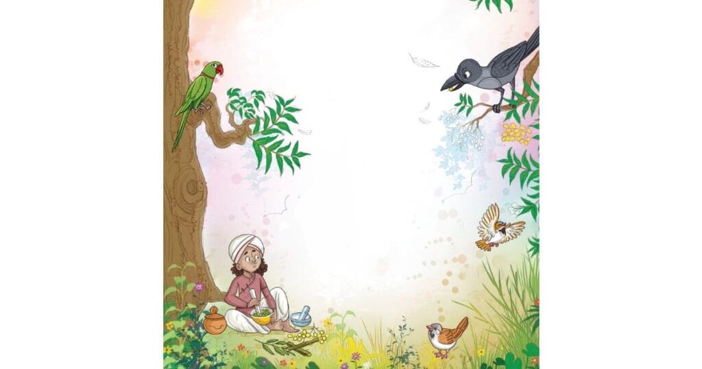 Ans. नीम का पेड़ हरा-भरा और बहुत उपयोगी होता है। इसकी पत्तियाँ कड़वी होती हैं, लेकिन यह कई बीमारियाँ दूर करता है और हवा को शुद्ध रखता है।