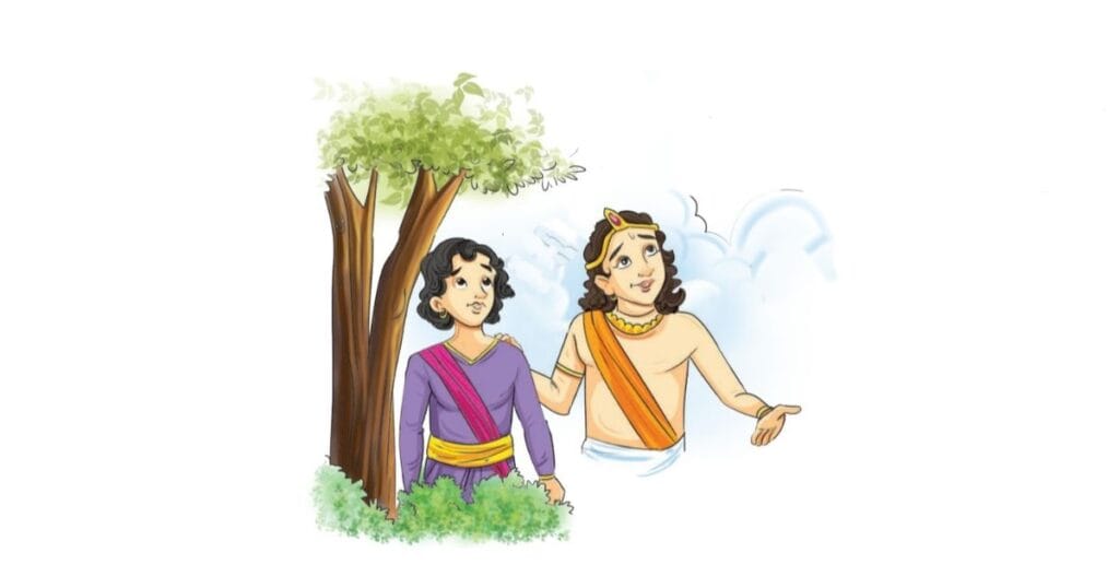 देवदत्त – अभी मैंने एक उड़ते हुए हंस को तीर मारकर नीचे गिराया था। मैंने अपनी आँखों से उसे गिरते देखा था। वह इधर कहीं आया है। (हँसकर) कुमार, मेरा लक्ष्य अब पूरी तरह सध गया है। कल मैं गुरुजी से कहूँगा तो वे कितने प्रसन्न होंगे! तुम मेरी गवाही दोगे न?
