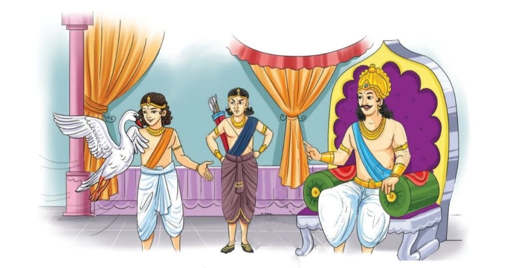 महाराज – शांत देवदत्त, क्रोध मत करो। तुम कहते हो कि यह हंस तुम्हारा है क्योंकि तुमने इसका आखेट किया है।