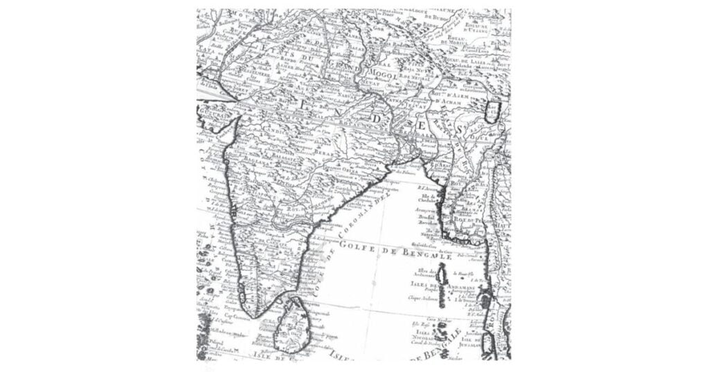 (1) इस मानचित्र में वर्तमान मानचित्र की भाँति भारतीय उपमहाद्वीप को दर्शाया गया है। इस मानचित्र में कुछ जाने-पहचाने नाम भी हैं, जैसे-कन्नौज, सूरत आदि।