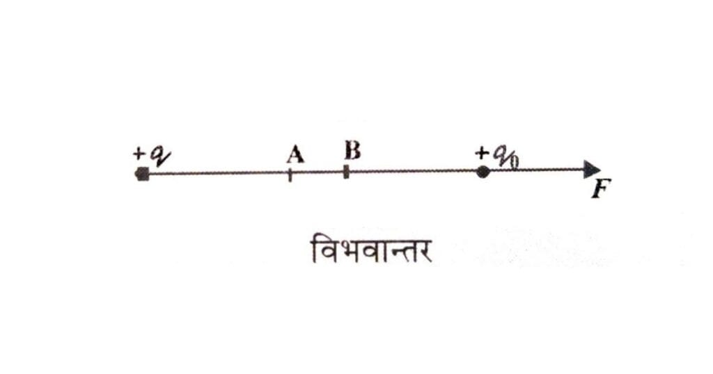 माना +qo एक अत्यल्प परीक्षण आवेश है जिसके कारण पूर्व से विद्यमान वैद्युत क्षेत्र पर कोई प्रभाव नहीं पड़ता। यदि इस परीक्षण आवेश को (चित्रानुसार) बिंदु B से बिन्दु A तक ले जाने में किया गया कार्य W हो तो बिन्दुओं A व B के बीच वैद्युत विभवान्तर,