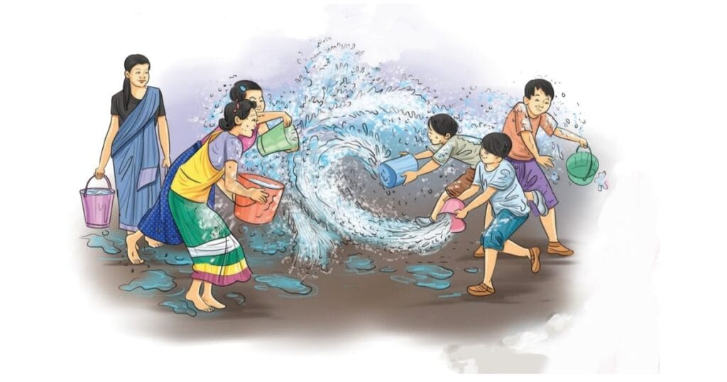 हँसी-खुशी के इस वातावरण में वल्लरी ने देखा कि लोग एक-दूसरे पर बालटियाँ भर-भरकर पानी डाल रहे हैं। वे एक-दूसरे के चेहरों पर चावल का आटा भी लगा रहे हैं। वल्लरी को होली की याद आ गई। उसने चाऊतान से कहा, “चाऊतान भाई, लगता है कि लोग होली का त्योहार मना रहे हैं।” चाऊतान बोला, “तुम्हें मालूम नहीं, आज हमारे यहाँ साङकेन का त्योहार है। आज से हमारा नया वर्ष आरंभ होता है।”