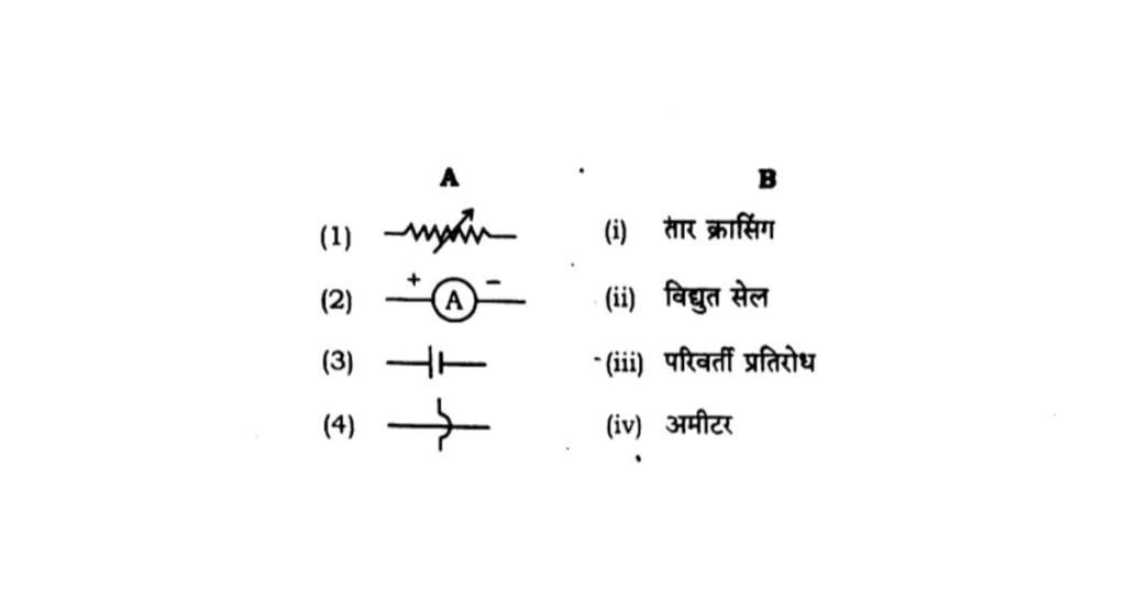 6. विद्युत परिपथ में प्रयुक्त होने वाले कुछ अवयवों के संकेत चिह्न स्तम्भ में दिये गये हैं। स्तम्भ B में दिये गये नामों से सुमेलन कर सही विकल्प का चयन कीजिए: