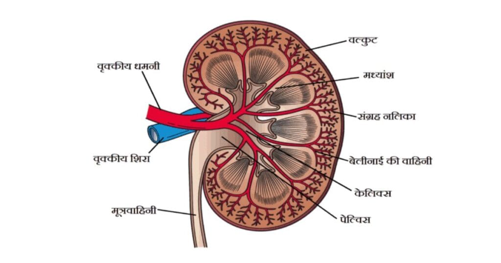 • रिनल पेल्विस (Renal pelvis): केंद्र भाग, जो मूत्र को मूत्रमार्ग (Ureter) की ओर ले जाता है।