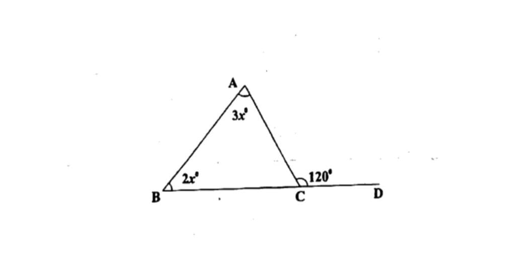 बिन्दु C पर त्रिभुज के बाहरी कोण का मान 120° दिया है।