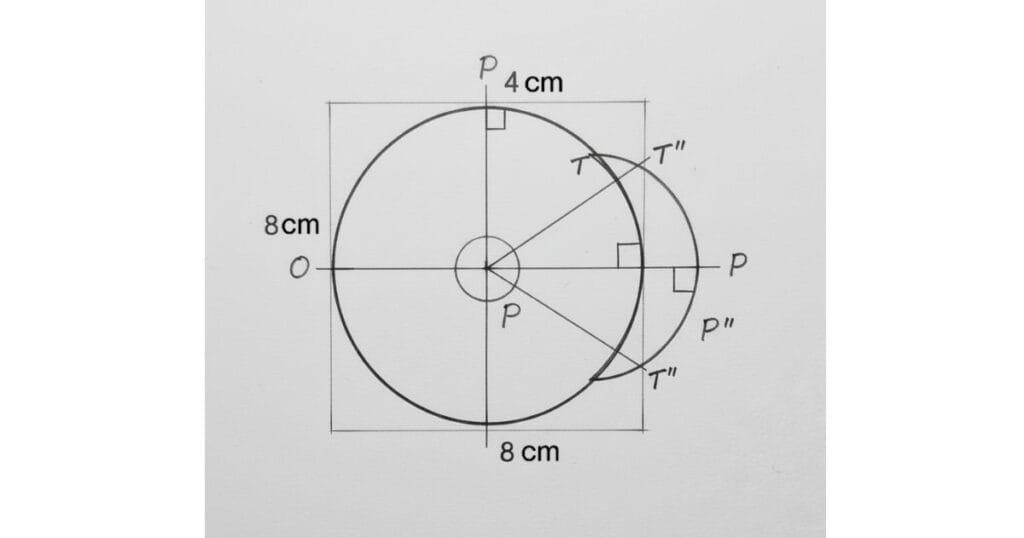 5. यह वृत्त बड़े और छोटे वृत्त को चार बिंदुओं पर काटेगा – इन्हें T, T′, T″, T‴ नाम दें।