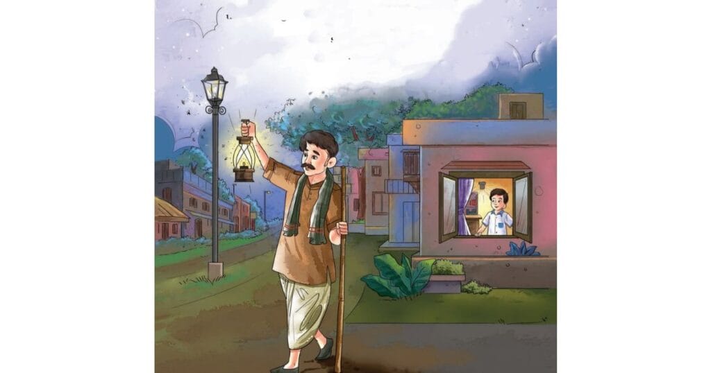 On my way back home, I see people returning from work, children playing, gardeners working, and street lights being lit.